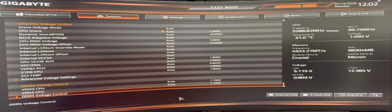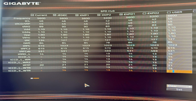 Na, tegnap 1.25-ön volt a fesz, de gondoltam megnézem mit tud alacsonyabbon, ha már elvileg az 5600-at tudnia kellene 1.1V-on, onnan kb 5-6 órás szívás volt visszahozni, hogy újra működjön, most viszont 5600mhz és csak 1.1V, fél óra c23+furmark egyszerre nem volt probléma a gépnek, majd nézek még célzottan stress tesztet, így most nem User profile a ram mhz/spd/volt hanem XMP1 mód, ez korábban nem akart üzemelni. XMP1-ben 1.1V-ot ad neki alapból a lap.