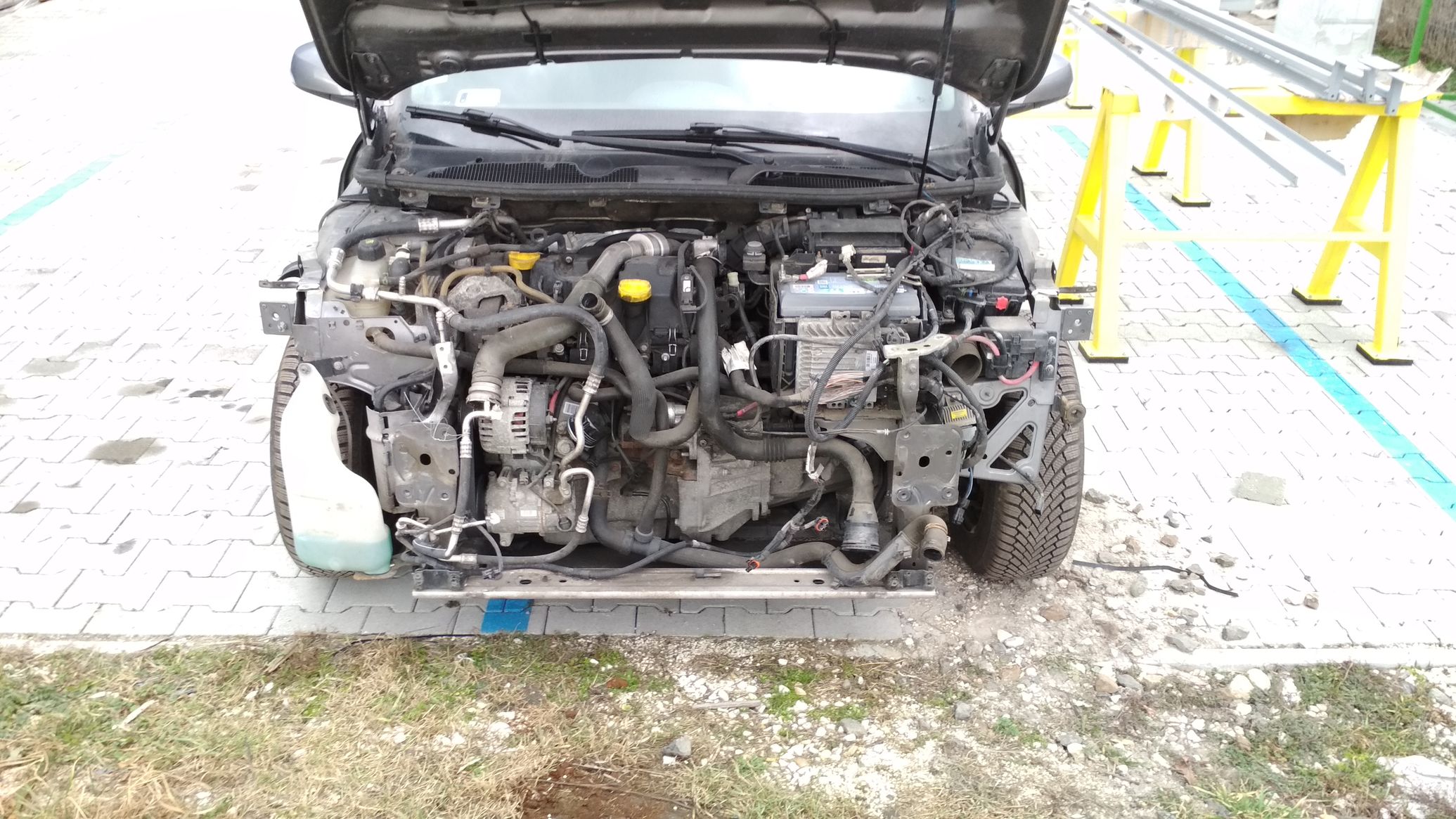 Nem nyílt légzsák, nyúlvány sem ment el, csak a felső lámpatartó tartópillére, amire a homlokfal is csatlakozik, az ment picit hátrébb. A másik meg a sárvédő felfogatási pontja volt arrébb, de az nagyon minimálisan, kalapáccsal simán visszament a helyére.