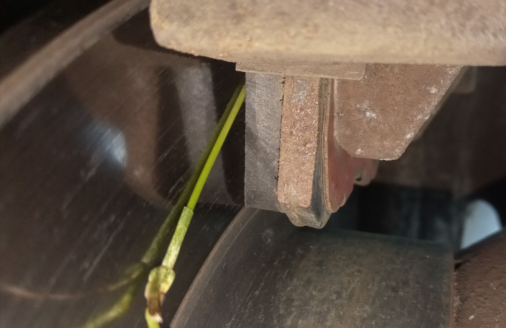 (a hátsó fékbetét behúzott kéziféknél nem illeszkedik a tárcsára - a zöld növény csak a jobb szemléltetés miatt van ott) Pedig TRW-t vettem... nem ócska alsó polcos betét & tárcsa.
