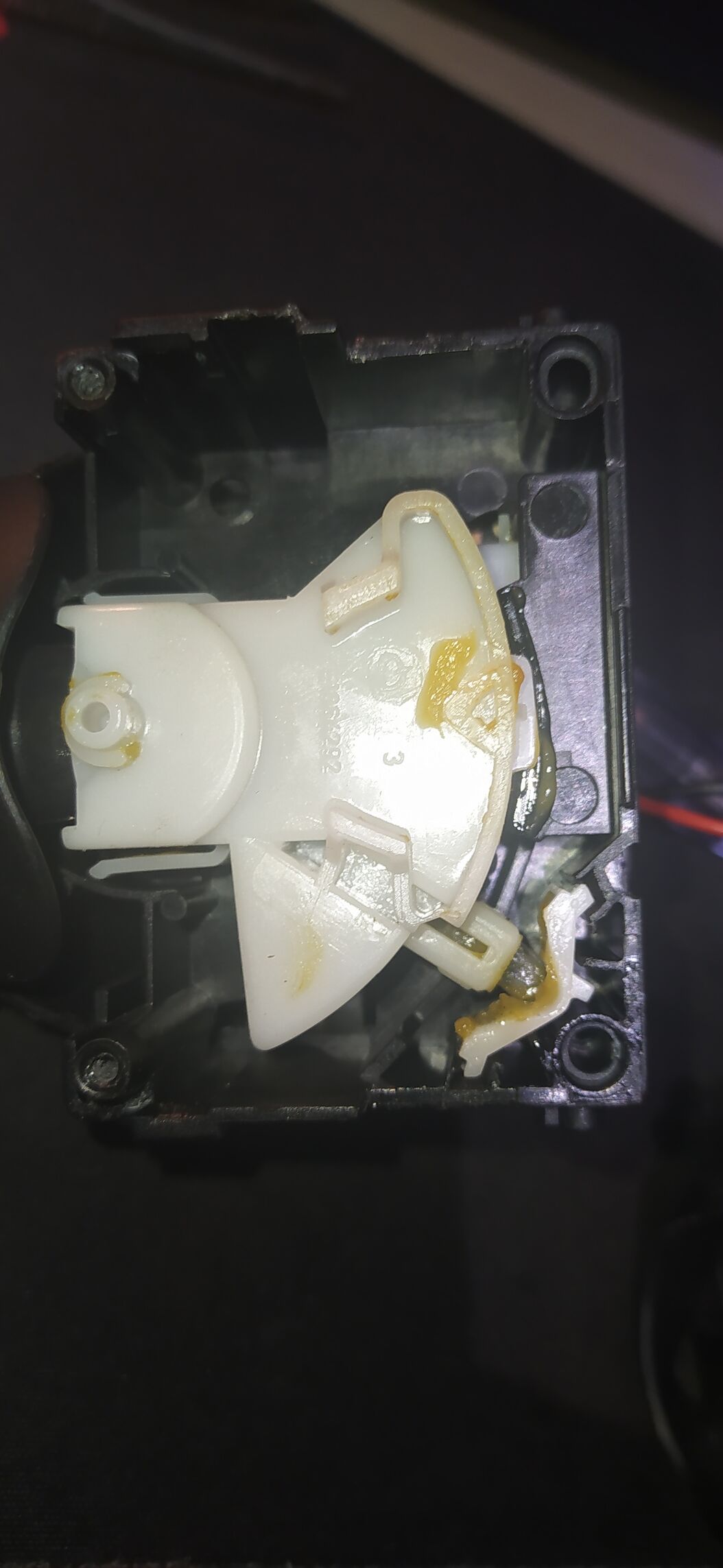 A tervem legelőször csak a bekarikázott rész átrakása volt. Ez nem tudom, hogyan van rögzítve, de nem bírtam kihúzni. Úgy voltam vele ha már szétszedtem, akkor valahogy megoldom a problémát és kicserélem a komplett nagy fehér részt, de emiatt le kellett szedni a hátlapot is. A rossz karral kezdtem, mert azt már úgyse fogom használni ha esetleg nem tudom összerakni. Ekkor láttam, hogy van benne 3db csúszó. Ha nem követtem volna el azt a galibát, hogy 1 csatlakozónál felkapcsolom a lámpát, biztos nem ijedtem volna ennyire meg amennyire megvoltam. Konkrétan remegtem és sirhatnékom volt. Már láttam magam előtt, hogy ebből renault szervíz lesz ahol újra kell majd programozni a gépet. Aksi sarut vettem még le, de az sem segített. Aztán szép fokozatosan megnyugodtam és eszembe jutott még, hogy a csúszkákon módosítok. Meglátásom szerint amúgy ami miatt "sorjás" volt az új kapcsoló azt a keményebb rúgó okozza ami a kis pöcök mögött van. (ez a része van pirossal bekarikázva), most olyan puha lett mint a régi