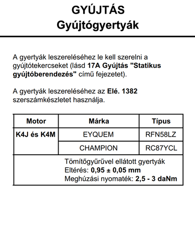 Nekem K4M760-hoz elvileg ezek a gyárilag ajánlott gyertyák. Érdekes mód 0,95+- 0,05 a hézag. Bár az Eyquem gyertya 0,9re van állítva alapból, szóval elvileg jó. Olvastam máshol is, hogy főleg a 16szelepesek sokkal kenyesebbek ha nem a gyári gyertya van bele teve. Lehet meg kellene próbálnom. Vagy a te általad ajánlott Densot. -
