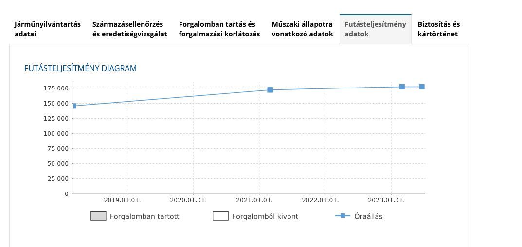 A rögzített óraállásokról: Hármat biztosan tudni, hogy mik voltak. Az első: 2018.03.09. - az első itthoni műszakija illetve az eredetvizsga időpontja. A második: 2021.03.04. - a soron következő műszaki vizsga, valamint harmadik: 2023.03.02. a legutóbbi műszaki vizsga időpontja.