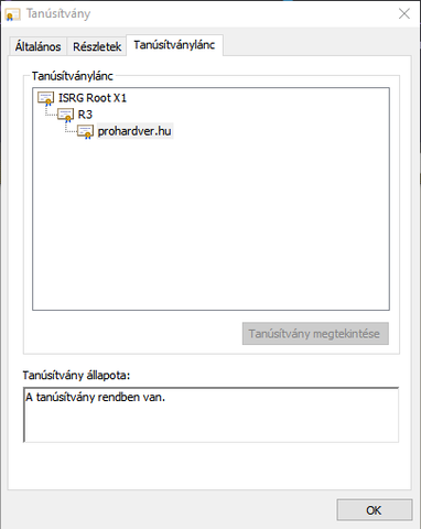 A tünet a megválaszolt hozzászólásban le van írva. Az R3-ról van szó, az a Let's Encrypt Cert. Korábban már töröltem, ami nem hozott változást, onnantól kezdett nehéz lenni a történet. A képen már a jó állapot van, eddig a gyökértanúsítványa vagy mije nem az ISRG Root X1 volt, hanem valami tök más. Azt töröltem a tanúsítvány tárolóból és utána kereste ezt az ISRG-t a legfelsőbb szintű tárolóban. Telepítettem, de még mindig nem volt jó. Ezután töröltem megint az R3-at (Let's Encrypt), és egy F5 után már sírás nélkül bejött a weboldal, ami a Let's Encrypt-et igényli. Szóval amíg nem volt rendbe téve az R3 gyökértanúsítványa, addig az R3-mat is hiába variáltam.
