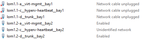 Sziasztok! Kis gondban vagyok, egy 2012 R2 DC alapokon lévő Hyper-V cluster egyik node-ján látom az alábbiakat (HP BL G8) egy leállítás-újraindítás óta (network cable unplugged). A fizikai összeköttetés rendben, az Onboard Adminon nem látok hibát (Interconnect), Virtual Connect Managerben szintén (Server Profiles, Ethernet Networks). Any clue?