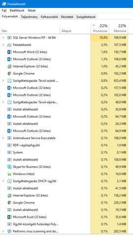 Még nem monitoroztam, de jogos, csak checkmk van a fontosabb eseményekre belőve. Éjszaka újraindítottam és ma még nem volt panasz, többször beléptem és repül, mint a kisangyal. De ha újra lassulás lesz, monitorozok. Találtam olyan cikket, amely szerint driver hiba okozhatja az adott rendszerfolyamat (nem fog beugrani, melyik, főleg így, hogy magyarítottam a rendszert) kiugrását, de az is naprakész volt. Ekkor fordultam ide. Egyelőre megy a kicsike, olyanoknál látok kiugrást, ha valaki be-vagy kijelentkezik, de ez ugye nem konstans terhelés, illetve pdf összefűző programot meg jre-t használót is kellett telepíteni, de ezeknél sem tapasztaltam folyamatosan magas terhelést.