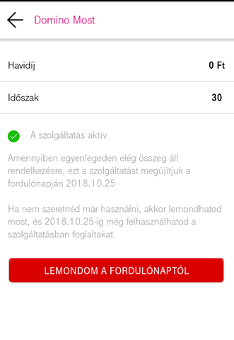 Viszont a régi alkalmazásban nem tudtam bekapcsolni ezt az új Domin szolgáltatást, a 600Ft/ 300 perc opciót. Le kellett frissíteni.
