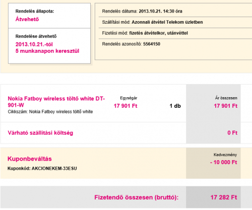 Igen,végig a -10000ft csökkentett összeget írta. Nem kizárt valami rendszerhiba,mert átvételkor az ügyintéző is kb 10 perc után tudott belépni a webshop oldalára és még azon belül is volt valami kavarodás,de azt már nem mondta,hogy mi. Részemről az adatok és a megrendelés szám stimmeltek,nem volt semmi probléma.