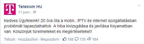 "Kedves Ügyfeleink! 20 óra óta a mobil-, IPTV és internet szolgáltatásban problémát tapasztalhattok. A hiba kivizsgálása és javítása folyamatban van. Köszönjük türelmeteket és megértéseteket!"