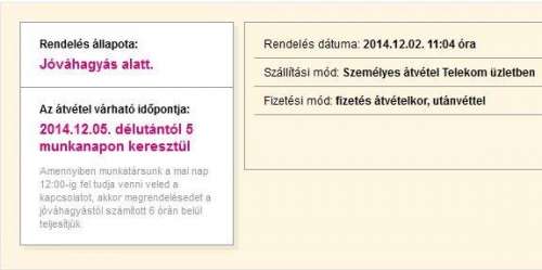 Pittyeg este a telóm, nézem: írja a T, hogy a rendelt készülék az atvevőhelyre megérkezett. Na mondom, az szép, már szerdán át is vettem.