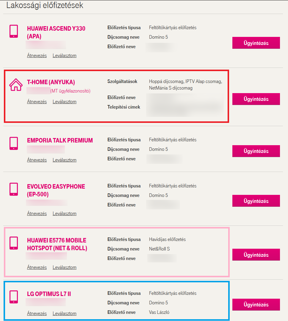 Most abban a lakásban amiben én és a nagyszülők leginkább tartózkodunk, Invitel van (60-as ED3 Net + Start Max vezetékes számmal, valamint egy Net & Roll S előfizetés). A másik lakásba lett átköltöztetve a pirossal bekeretezett vezetékes Telekom szolgáltatások java, így a 30-as számokat csak onnan lehet kedvezményesen hívni.