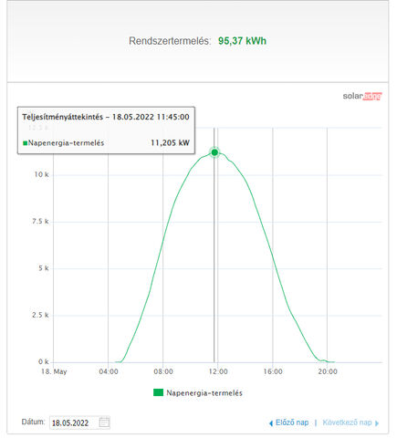 A 3 égtáj miatt kb. 7,4-7,6kWp teljesítmény jött eddig a tetőről maximum, de majd ha bővíteni kell (pl. lesz egyszer villanyautó, vagy gázkazán helyett hőszivattyú), akkor viszont még 4,5-5kW-nyi panelt tudok bővíteni garázsbeálló-tetőre.