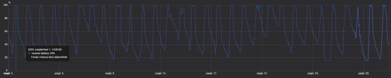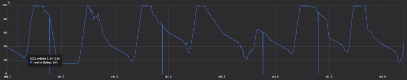 Home Assistant átállítja 10% alatt battery first-re a töltést és 15%-nál visszaállítja load first-re. Így télen is szépen a borús napokon mindig 10% felett maradt. Marad 5%-om ha abszolút sötét van napoking az önkisüléshez ami kevesebb mint 0.5% naponta. Szóval nem nagyon mentem még 8-9% alá soha ezzel a beállítással.Viszont ma arra értem vissza, hogy 1%-on volt az akku és 56-os (?) hibakód van a kijelzőn ami low battery voltage miközben offgrid üzemmódban az inverter be van kapcsolva a shutdown nem történt meg. Nem termelt áramot a ház sötét volt, de maga az inverter be volt kapcsolva világított a kijelző