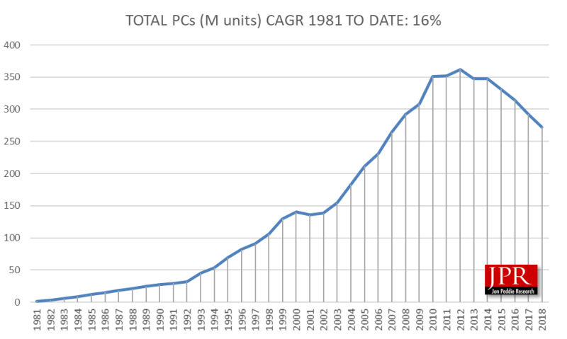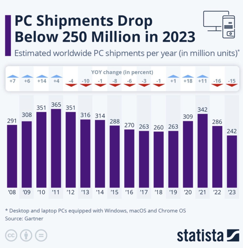 Míg 1997-2006 időszakban kb 1-2 évente vett mindneki új PC-t, mert annyira gyors volt a fejlődés, hoggy KELLETT is, addig 2010 után a Core I CPU-k megjelenésével jeletősen lassult a dolog, és ezért mindenki ritkábban fejleszt, és nem jelenik meg minden évben mint vásárló. Sőt, egyre ritkábban.