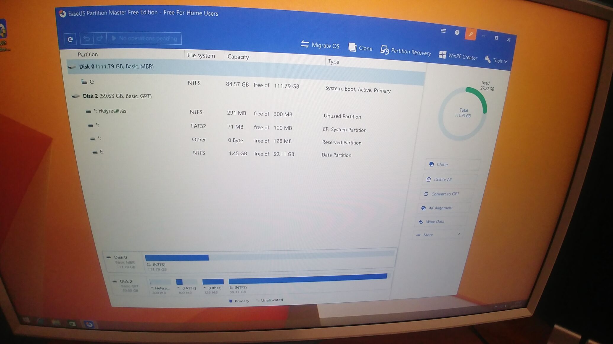 Miután megnyomtad a végrehajtás gombot, mert azt a képen még nem nyomtad meg, eltűnt a GPT a Disk 2 mellől? Ha eltűnt, akkor a biosod jelenlegi beállításai mellett is tudsz rá telepíteni az MBR-es telepítő USB-ről. Ha nem tűnt el, akkor átkonvertálhatod, de egy GPT –s window 10 telepítővel le is törölheted (csak nem folytatod a telepítést).