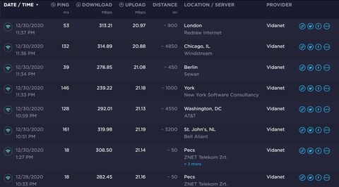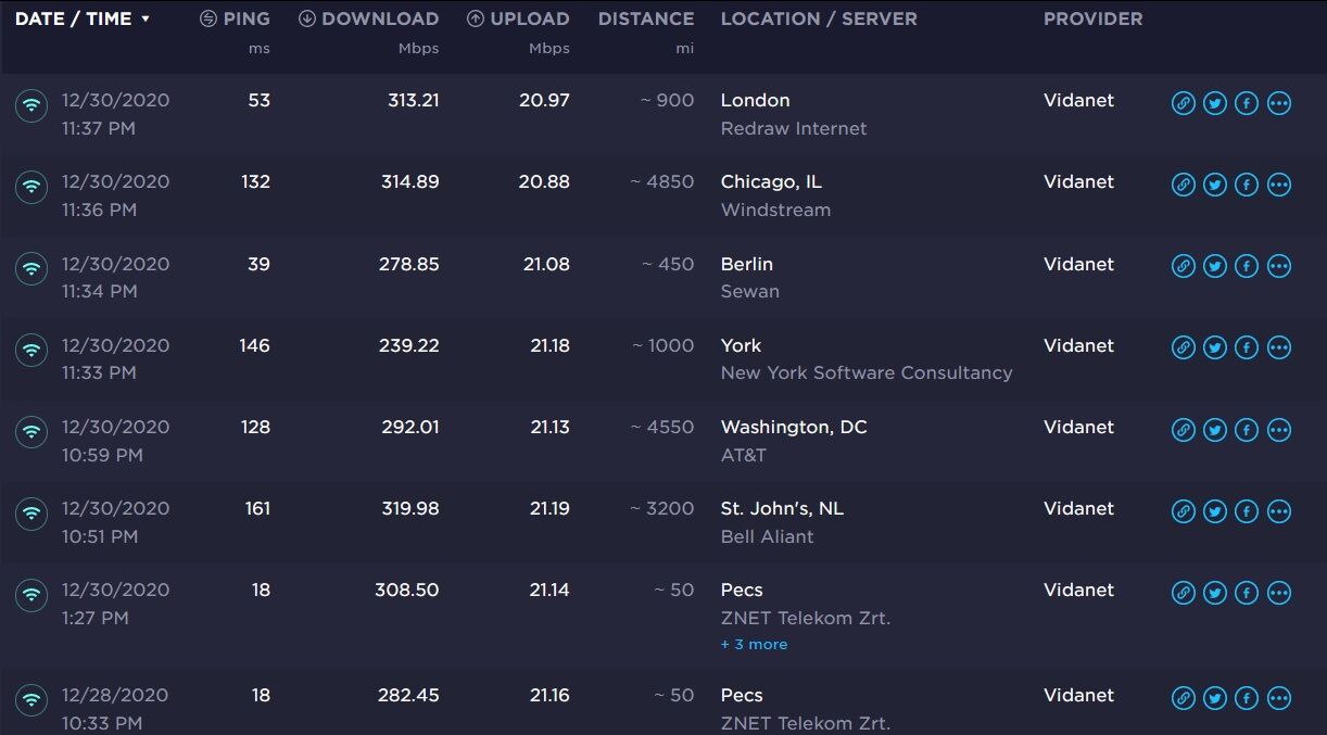 Szolgáltatóm Kaposvár Vidanet (300/20 net), aki elvileg T-com. Nem tudom ki a szűk keresztmetszet, de ez így nem jó. A tévé Netflix alkalmazása 55 Mbps-et mért valamelyik szerverével... Abba azért beleférne a 15.25 Mbps. Tévé böngészőjéből a fast.com 82Mbps-et mért. Laptopról firefox böngészőből a fast.com 150 Mbps-et. Speedtesten mérve megvan a 300/20 netsebesség. Kíváncsiságból megnéztem pár távoli szerverrel mi a sebesség: