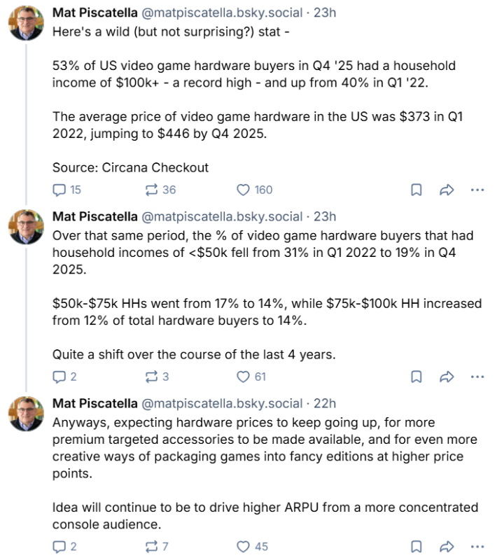 Azért van egy olyan érzésem, hogy ha Series X|S konzolból nem ~35 millió ment volna el, hanem pl. 135 millió (vagy legyen annyi mint PS5), és annak nagy része a Series S, akkor valószínűleg nem lenne ekkora ügy abból (vagy publikusan nem lehetne ennyit hallani róla), hogy gyenge ez Gen9-es konzolnak...