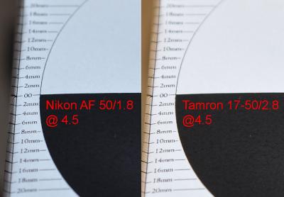 Akár a Tamron 17-50/2.8-al (50 mm-en), akár a Nikon 50/1.8D-vel nézem, mindkettőt kb. egy centivel előrébb fókuszálja fél méteres táv mellett, mint kellene...