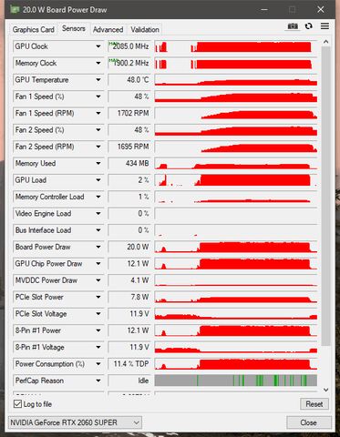 GPU-Z-t ha esetleg használsz, ott lehet logolni játék közben, hogy pl. amikor bevillan a kép, akkor mennyin volt a GPU load, hőmérséklet stb.