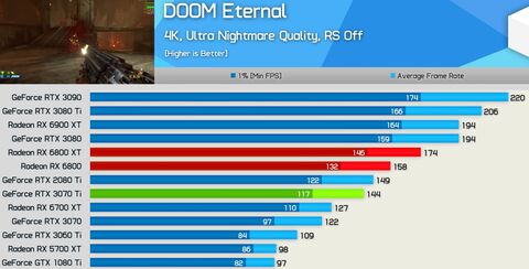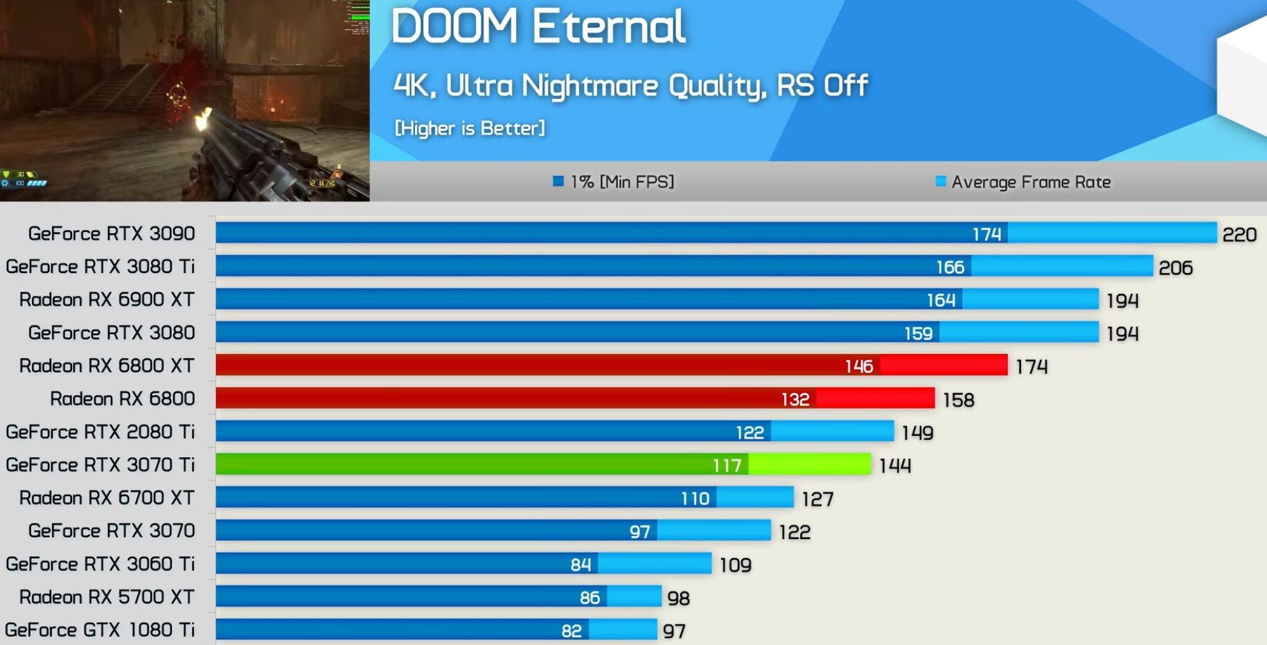 De Doom 4K-ban (1440p-ben szintén így volt, tehát 3070Ti, utána 2080Ti és végül 3070) hirtelen felborul a pálya.