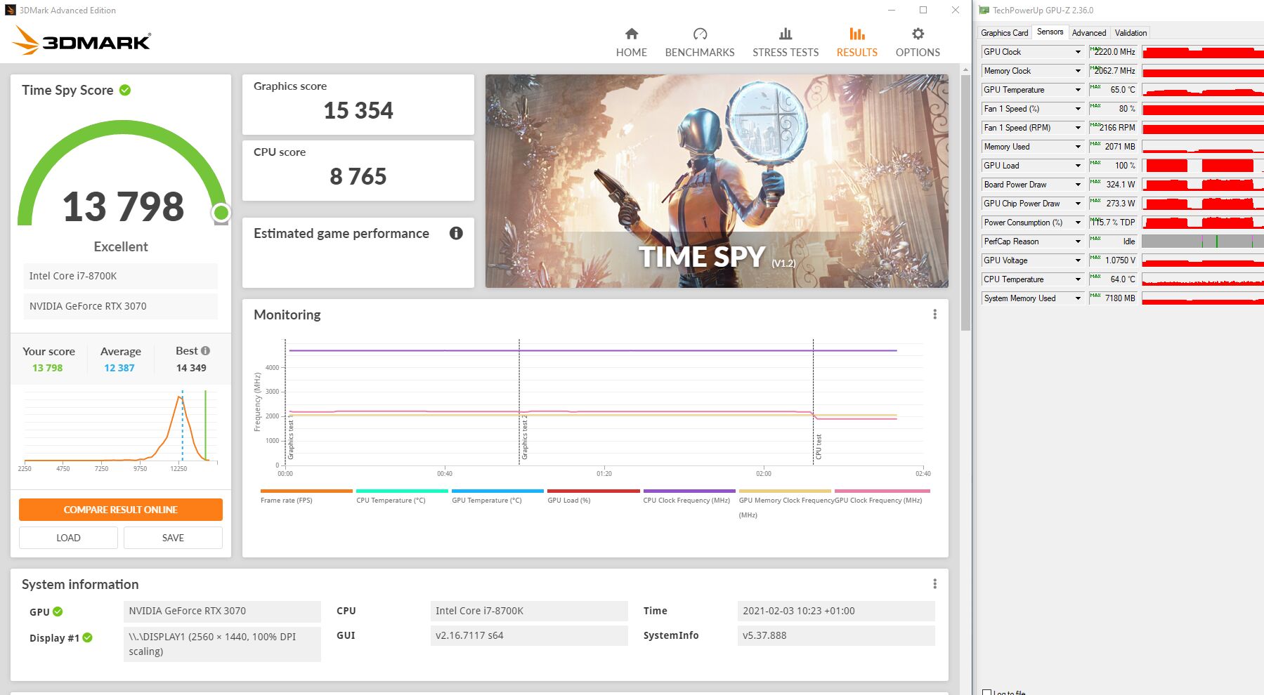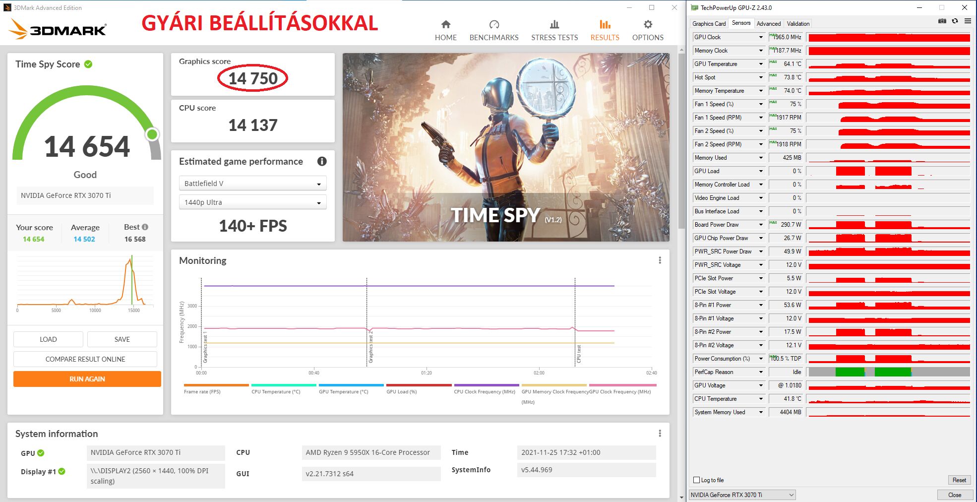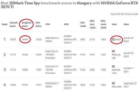 Tehát meglepően keveset fogyasztott, de 14.8xx GS volt a teteje Time Spy-ban, holott evga ftw3 ultra 3070-esem tudott 300W-ból 15.376 GS-t.
