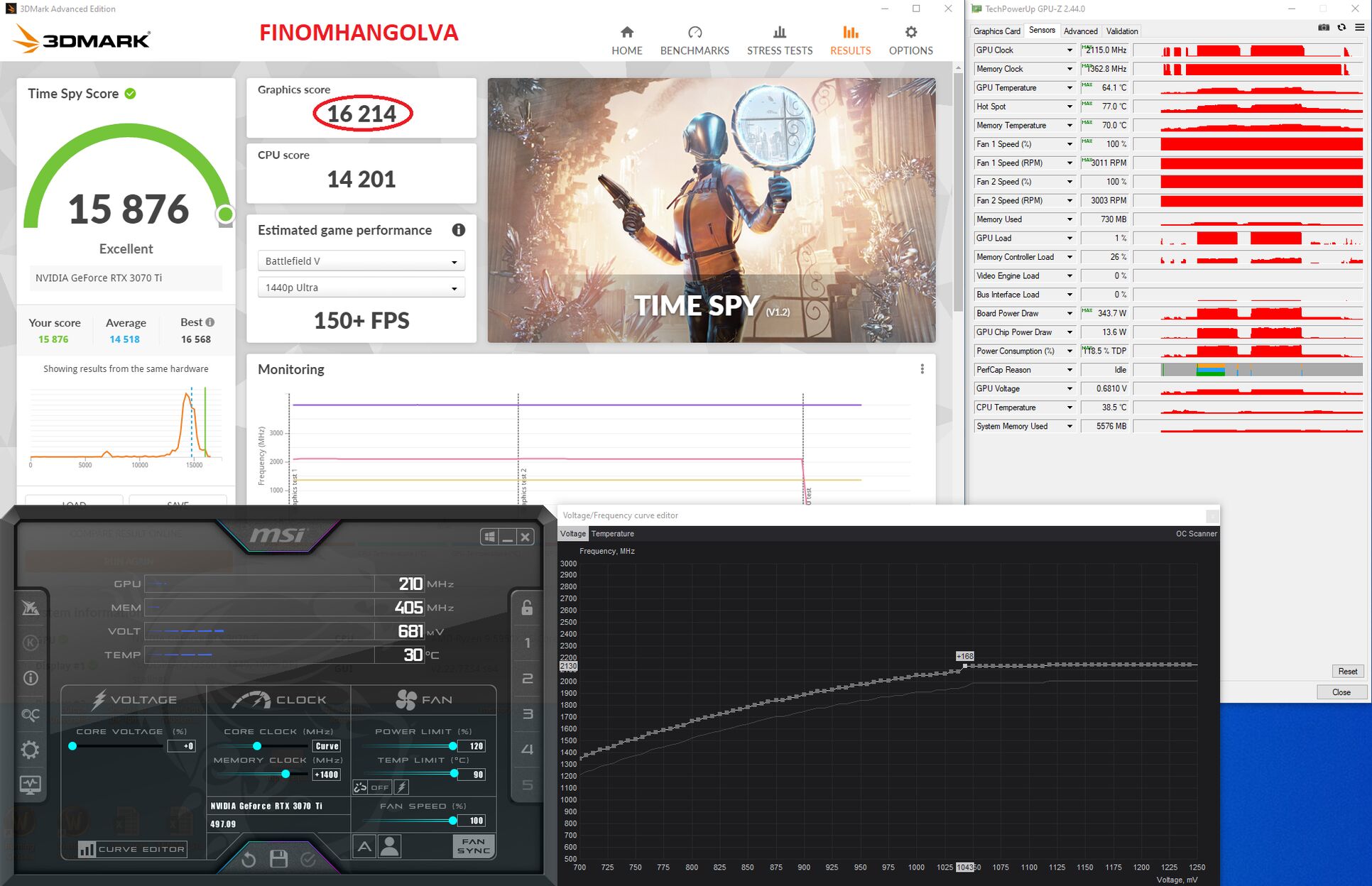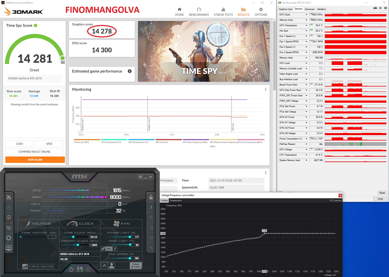 A "probléma" az, hogy +1400 a memória, és 1-1 artifactot szerintem láttam a benchmarkban, ergo nem lehet vmi stabil a dolog, nem is nézem meg a cyberpunkot vele.12.300-12.400 pontos eredmény mellett, ami "fixált" 1.05V @2115MHz kilapított voltage/frequency curve-el, vagy 1.043-1.056V kb. csak megemelt curve-el, szóval így 1 óra játék után is stabil minden.