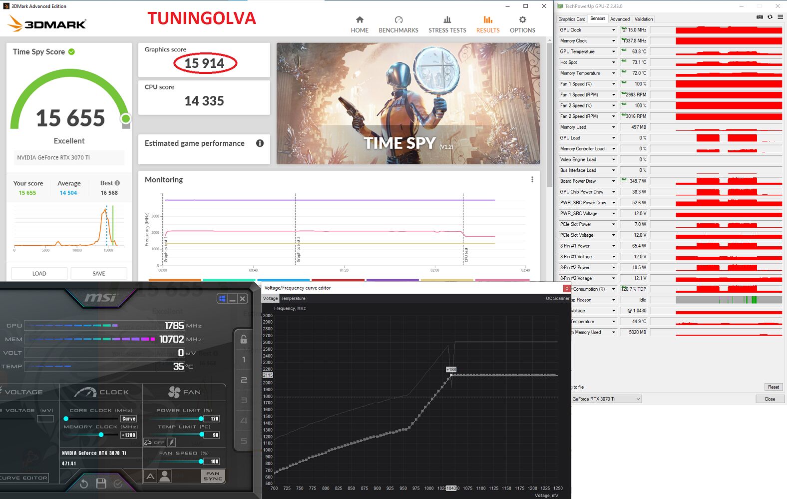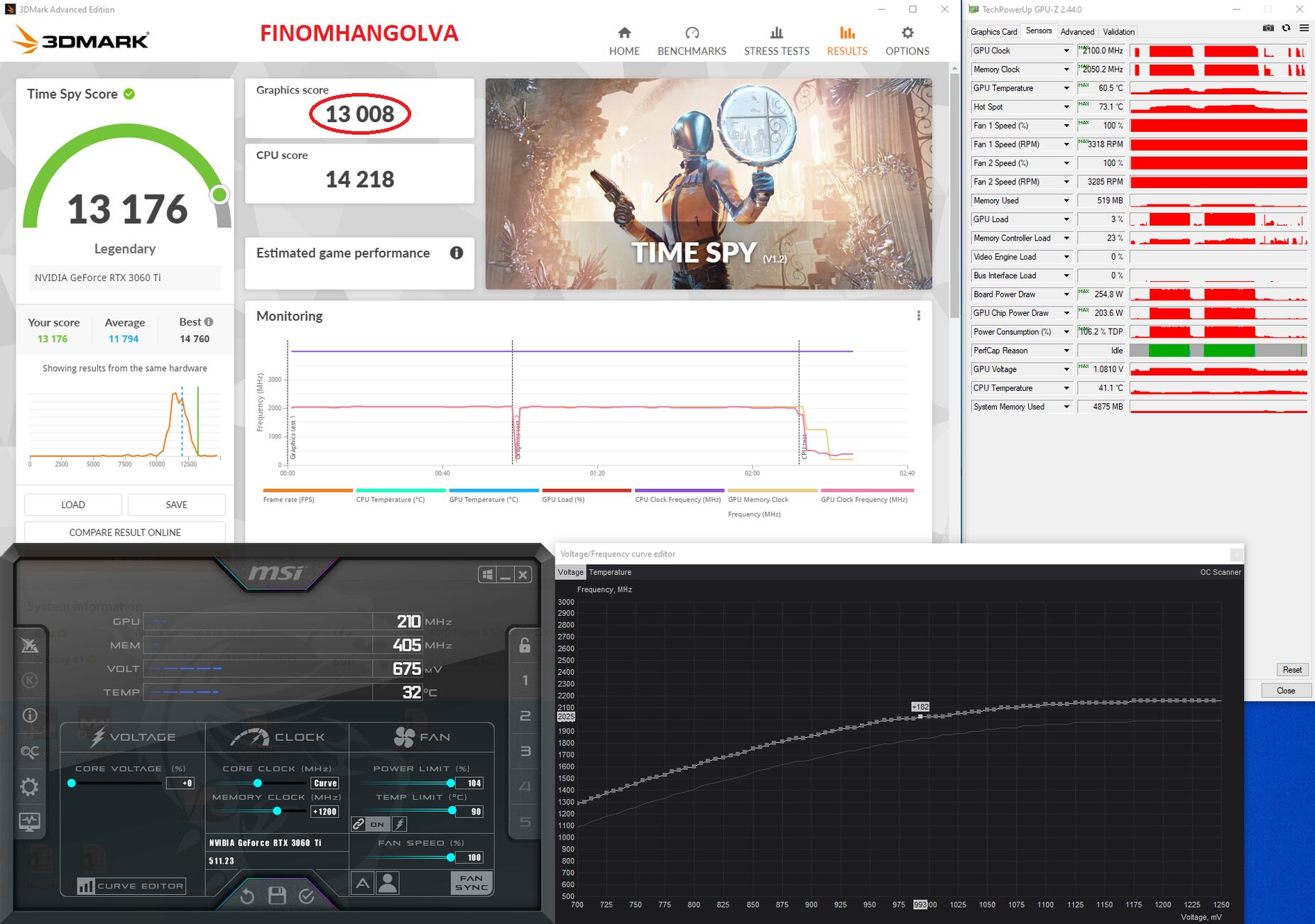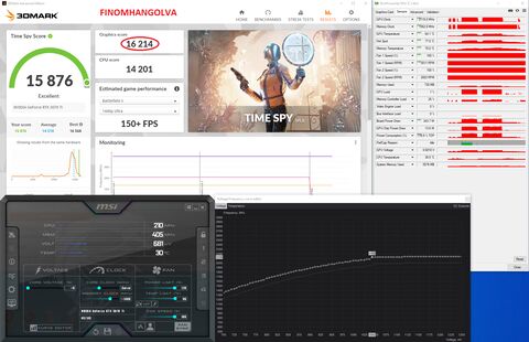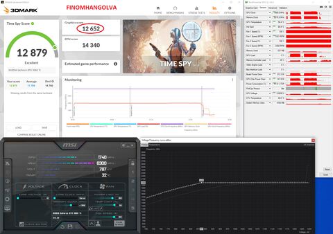 Kevesebb feszültséggel viszont lefut a teszt, de ez már egyben a silicon lottó kategória is (azt hiszem sem gainward, sem inno3d nem tudott ilyenkor ennyi ponttal lefutni), így több a pont, de nagyon fluktuál az órajel, a gainward és inno3d kártyával nem mozgott ennyire (aztán lehet csak további finomhangolás kérdése, azokkal tényleg 1-1 teljes napig szöszöltem, ezzel pedig eddig 2 órácskát).Mivel mindegyik kártyát ugyanazon a helyen rohangálva néztem meg cyberpunkban ugyanazon beállítások mellett, ezért ahol a gaming x trio átlag 72fps-t mutat, ott a másik 2 kártya 73-74-et tudott (1.0V-on használva őket), ez az 1-2fps ez kb. semmi, cserébe tényleg nincs hangja az msi-nek.