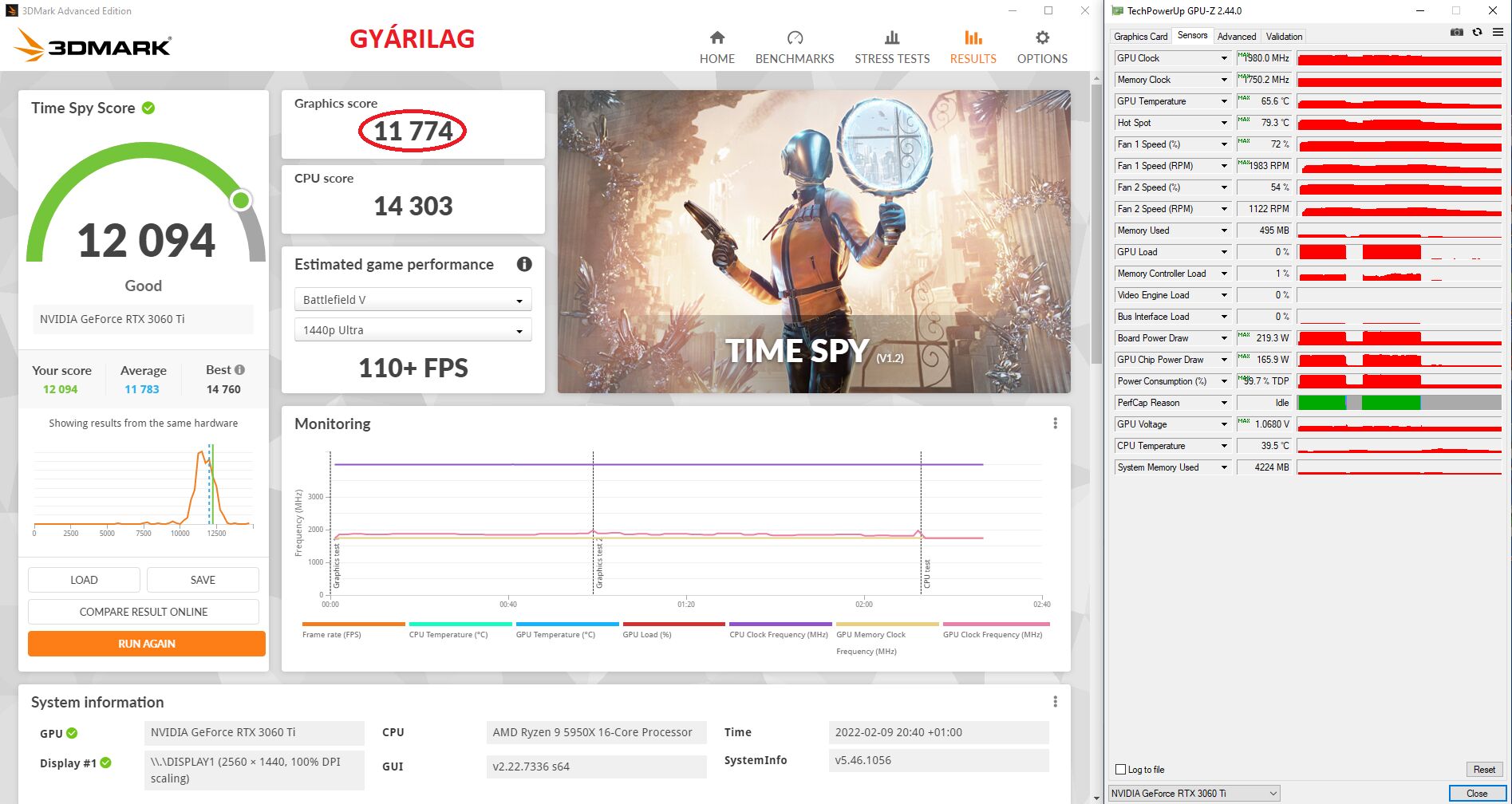 Az MSI kártya viszont a 250W miatt benézett 1950MHz és azalá is és esélyesen ezen a +10W-on múlna, hogy stabil 1995MHz környéke legyen és máris 11.700 pont fölé ugrana vele.Ugye előbbi kártyák tudtak 12ezer pont környékére menni, de az cyberpunkban nem volt stabil, ezért eleve a finomhangolt értékkel mértem itt is, amit a többire is alkalmaztam, tehát a számok itt csak a powerlimit miatt rosszabbak, alacsonyabb feszültséggel több pont lenne (de a többi kártyára is ilyen beállítás volt, így fair az összehasonlítás).