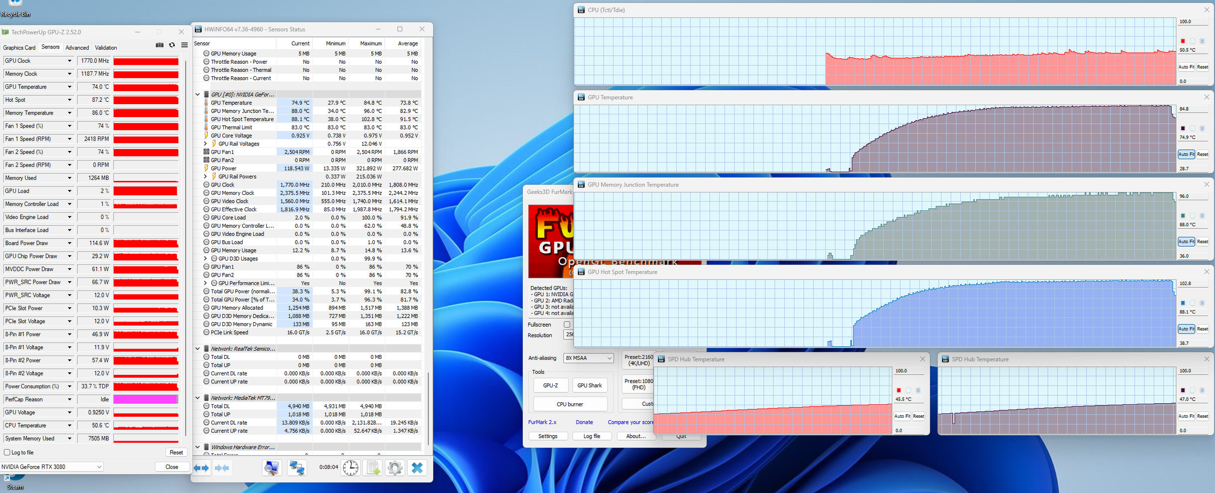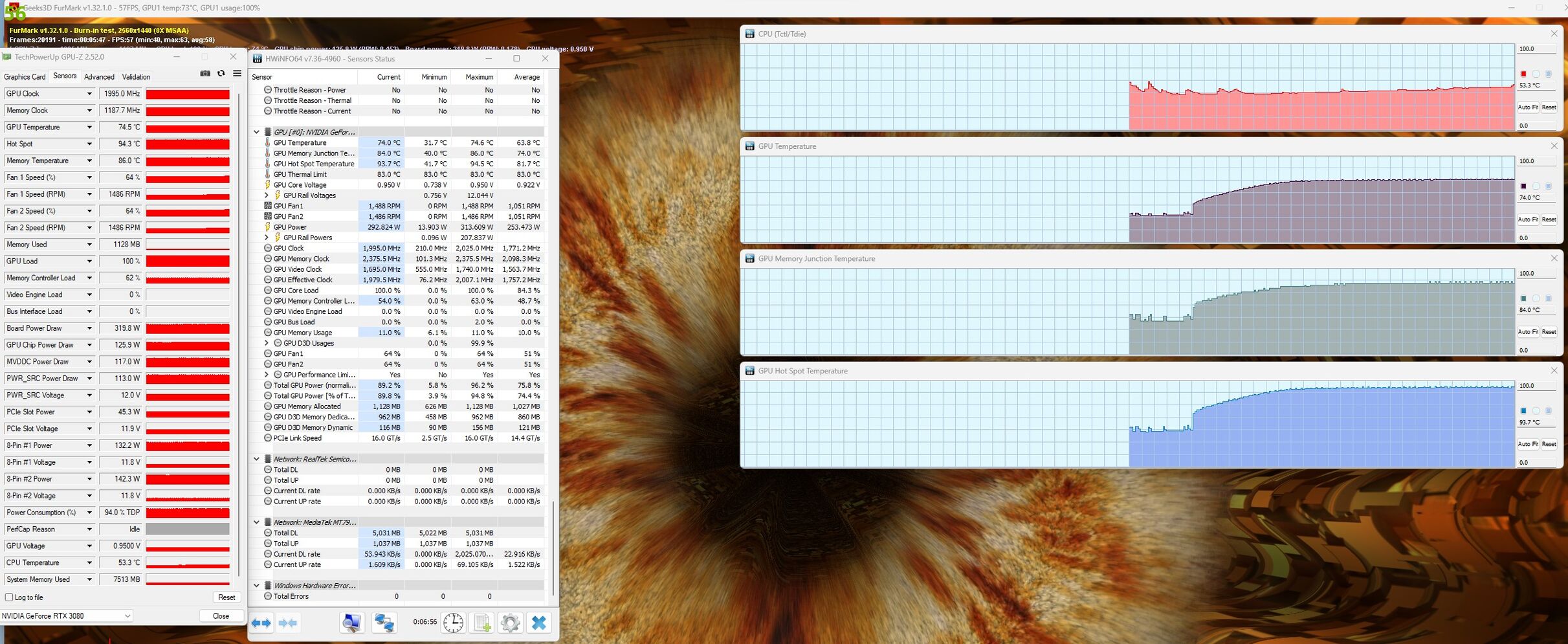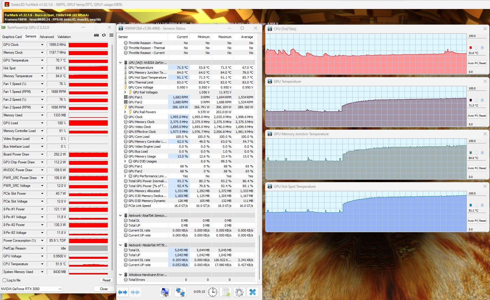 Na, szétkaptam, picit igazítottam és most ilyen. Ez kb 10fokkal kevesebb, mint az előbb. Viszont így sem drasztikuan hűvösebb, mint a gyáriakkal. Ha jól látom, a hotspot kb ugyan annyi, a RAM volt a gyárival 94, az újjal 86°C. Vagy ez már korrekt? (UV bár látszik a képen, 950mV@1995MHz):