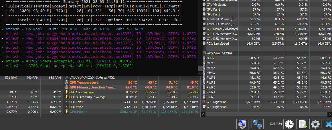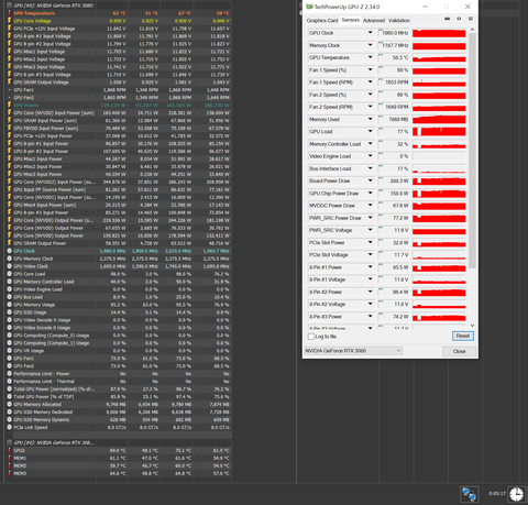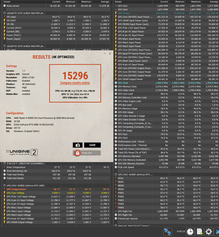Azért csak 12p-ig néztem mert kidobott a game valamiért nem tetszett neki az a 84% power limit, viszont 0.95V 2010 MHz stabil 100%-on (380W max mellett).De érdemes megnézd a ventiket...(FTW3-nál 3000 RPM ugye a 100%, kb 10%-ot le kell vonni MSI vagy GPU-Z értékből mert rosszul mutatja korábban beszéltük itt).