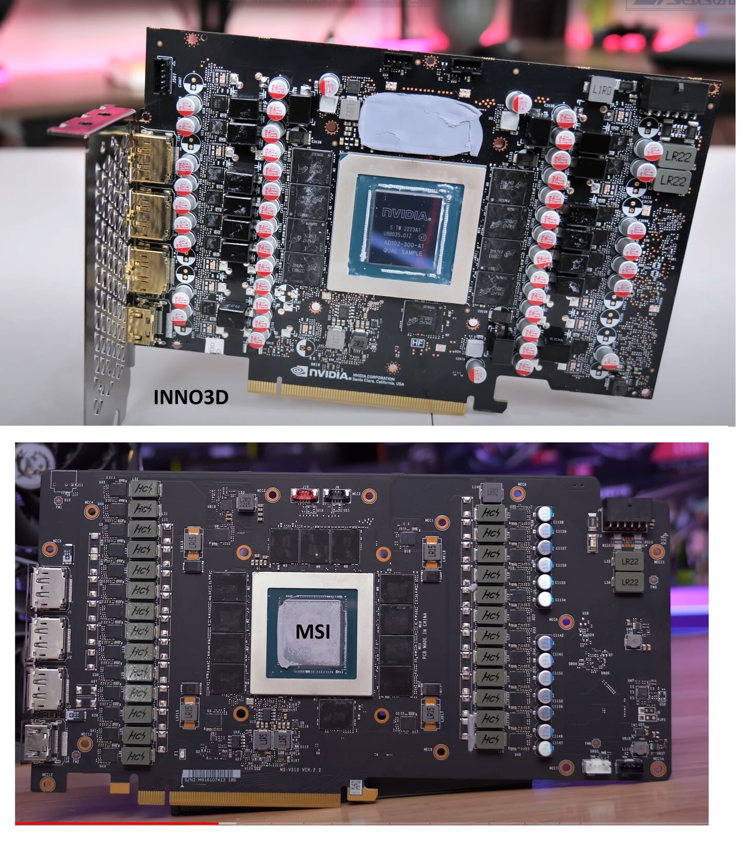 De azért tudjuk jól hogy egy inno3D az nem egy MSI vagy egy ASUS . Az alkatrészek nem a minőségről hiresek. Olcsó alkatrészeket dobálnak rá jó az úgy. Nézd meg itt van a kettő , szemmel Látható hogy az msi sokkal minőségibb alkatrészek pakol rá. A felső az inno3d 4090 az alsó az msi 4090.