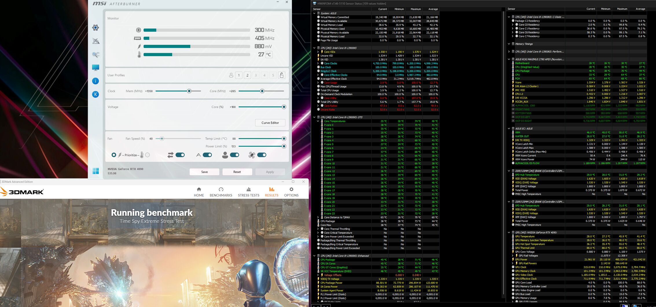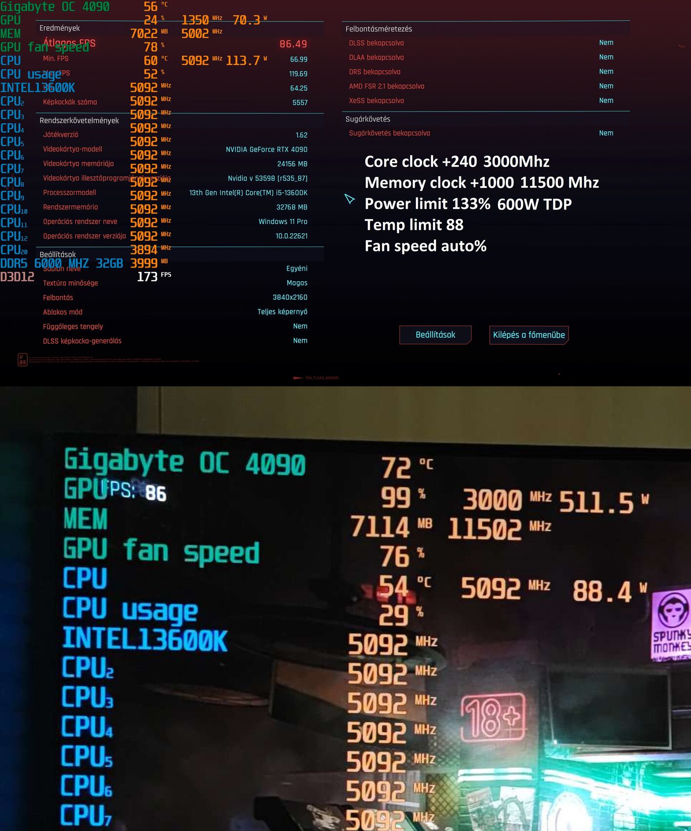 Lemértem én is neked hogy lásd . Sok értelme nincs azzal szenvedni hogy felhuzod a gput 2940 re vagy 3000 re mert olyan nagy FPS különbséget nem ad hogy most azért érdemes széthajtani a gépet. Csináltam neked egy tesztet 3000 vs 2700 alapon. Az egyiken 450 W tdp a másikon huztam 600w re de a játék nem evett meg 520 nál többet 3000 mhz és +1000 a memoria. Aztán ott vannak az fps különbségek nem egy egetverő hogy ezért érdemes volna húzni szerintem. 2700 is tökéletes . A 4090 alap orajelen olyan erős hogy nem érdemes húzni . Nálam alapon megy nem akad semmi. Csak a teszt idejére felhúztam ,hogy lássuk érdemes e vele szenvedni azért a pár fps miatt. Természetesen ez az érték nálam stabilan megy. Kb 5-6% gyorsabb. Annyi hogy a core voltage huztam még fel +100.