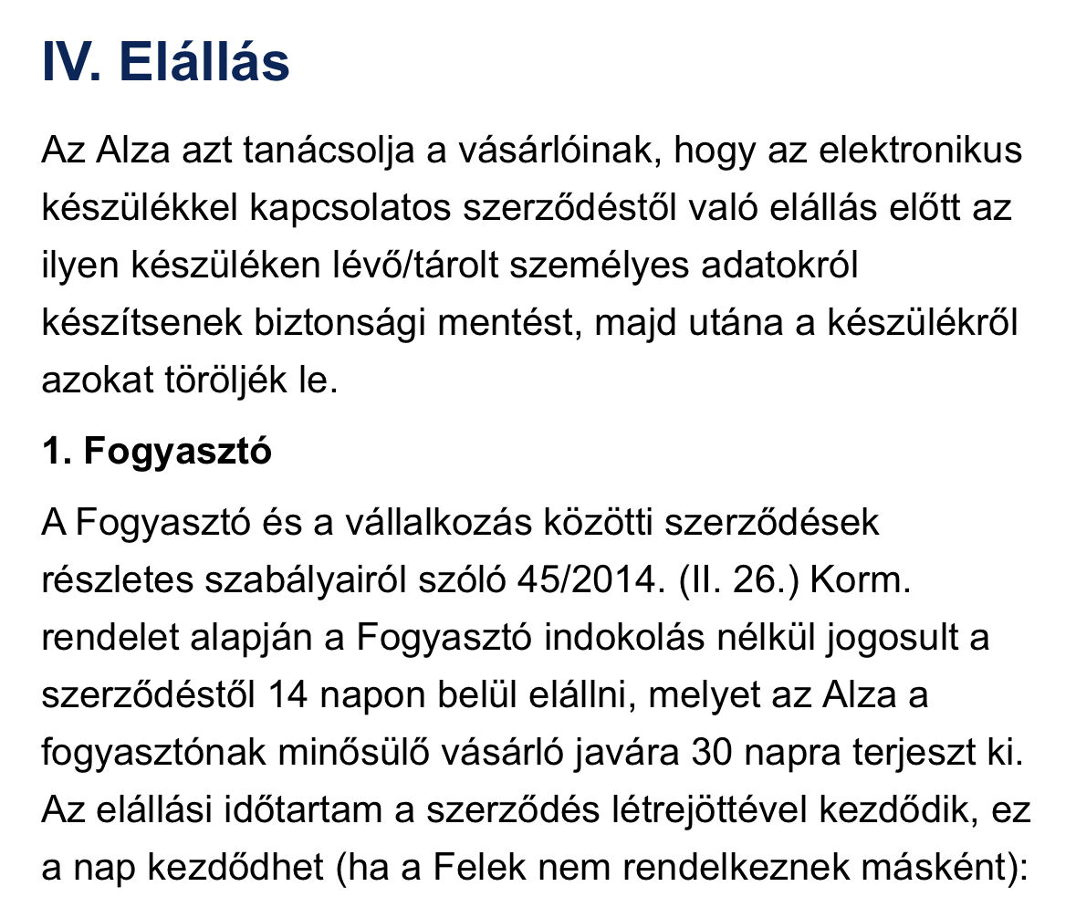 Nem néztem meg, hogy még mindig így van-e, de eMAG-nál is "kérdés nélküli" 30 nap van (volt 8 hónapja még) és 14 nap után ők intézik a postát. 40-es monitorom szürke színnél picit foltosodott, visszaküldtem, nem kellett keresgélnem szállítót (ekkora méretnél már nem olyan egyszerű/olcsó), jött a csávó, vitte, ha jól emlékszem a csere meg rá pár napra érkezett meg.