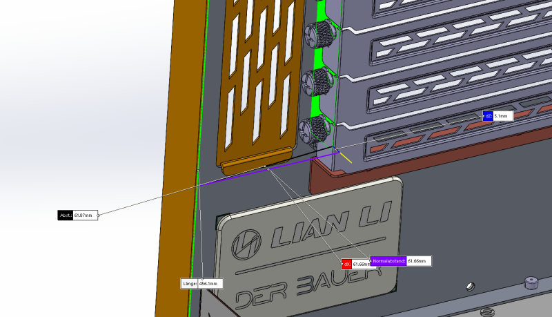 3+2 slot van rajta ugyan, de a legbelső slottal túl közel van az alaplaphoz, nagyon nyomja a PCIE szalagkábelt a magassága miatt. Az eggyel kintebbi slottal pedig a kártya pont az osztásba esik a 3+2 slot közé, ahol nem jó a kivágás mérete.. szóval előkerült a flex