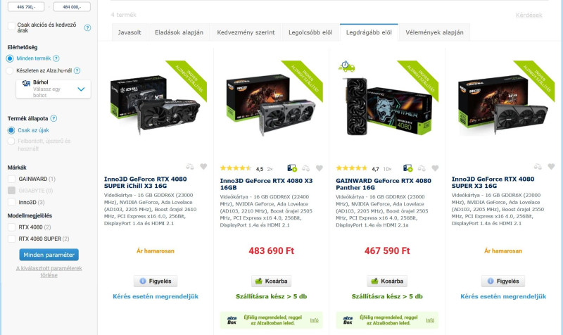 Csúszkával a legolcsóbb 4080 Super (fapados Inno) 446k, 3 ventis ichill 484k, 4070 Ti Super (szintén fapados Inno) 360k, 3 ventis ichill 377k.