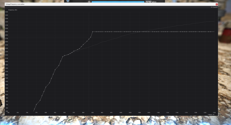 A görbét most csináltam tesztnek. 0.925v 2900 mhz körül van. Látszódik hogy 925 helyett 915 és az mhz se stimmel. Ahogy írtam feljebb ha 0.850 2500-at adok meg akkor 0.835re fog állni ~2300mhzvel.