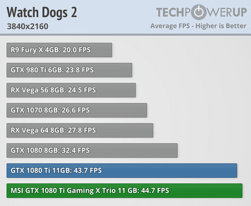 A Watch Dogs 2 ami nagyon megfogta a 1080Ti-t, de azért a 4K ultra grafika csak kárpotolja az embert.44 FPS de azért az se annyira játszhatatlan