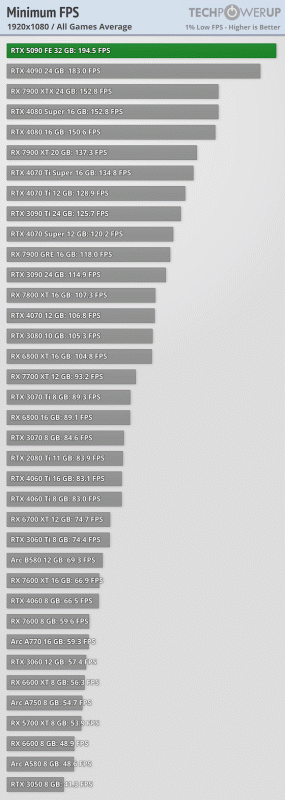 Ha megnézed a hivatkozott TPU tesztet is belinkeltem feljebb 1080 P ben is gyorsabb az 5090 átlag FPS ben és minim FPS ben sincs a legtöbb játékban gond.Ez játék/ motor specifkus dolgonak tűnik nekem.Az 5090 egy brutális monstrum számítási kapacításban.