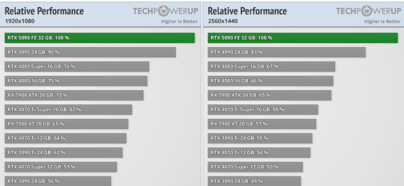 Pont hogy a sokkal kevesebb maggal rendelkező kártya esetében kisebb lesz a differencia az 5090-hez képest alacsony felbontáson. Majd 4K-ban elhúz úgye.