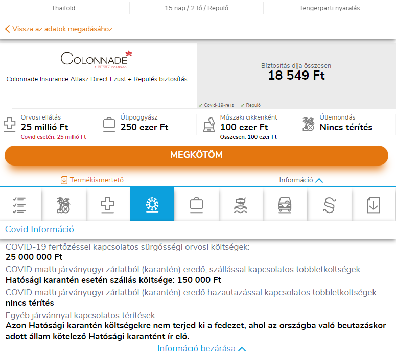 Végül fizette a repülőgép átfoglalást, kórházi ellátást.nézz körbe netrisk kalkulátorban, ott külön jelölik a covid fedezetes biztosítást.