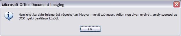 A Microsoft Office Document Imaging-ben nem tudok szövegfelismerést csinálni. Előtte mindig kidobja azt az üzit, hogy telepítsem a magyar optikai karakterfelismerési nyelvet. A beolvasás után meg azt, hogy: "nem lehet karakterfelismerést végrehajtani magyar nyelvű szövegen, adjon meg olyan nyelvet, amely szerepel az OCR nyelvi beállításai között. Pedig ott van magyar.