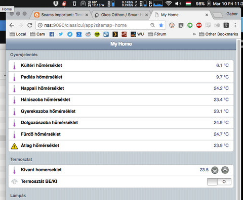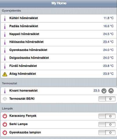 Persze van telefononos kliens is, illetve telefonos böngészőből is igy néz ki, de ez ne zavarjon senkit. Ez csak az OH funkciója, nem ez a lényeg. Ez az kezelőfelület kinézhet bárhogy, pl. 1 darab hőmérőt és 1 darab kapcsolót is mutathat, ettől függetlenül a "háttérben" sokmindent csinál. Nem is igazán használom ezt a megjelenítést, látszik hogy csak pár cuccot toltam ide. Ezt a parancssoros dolgot nem igazán értem... Sajnos sokan sokféleképpen értelmezik ezt a házvezérlés és házautomatizálás témát. A kettőt teljesen különálló dolog szerintem. Az egyikkel Te irányítás pl. egy weboldal, vagy tablet/telefon segítségével, a másikkal meg egy háttérben futó vezérlő az általad korábban megadott értékek alapján vezérel, automatikusan. Persze vannak átfedések