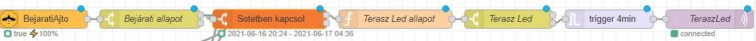 Zigbee2mqtt és Node-Red. Van egy ajtó zigbee nyitásérzékelővel. Node red -ben be van állítva hogy nyitásra kapcsoljon ledeket majd 4 perc mulva kapcsolja ki. Ez eddig rendben működik is.