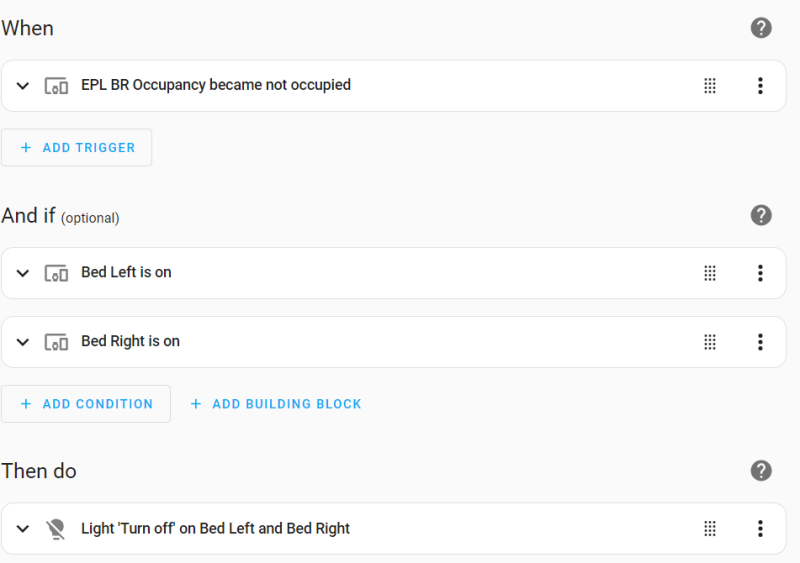 elég kezdő vagyok még a HA és a mmw szenzorok világában így a segítségeteket kérném. Hálószobánkban van egy egy Everything Presence Sensor Lite érzékelő és az ágy melletti Ikeás zigbee-s led-es körtéket szeretném időszakosan felkapcsolni, ha a fényviszonyok és a jelenlét indokolja. De időnként nem érzékeli, hogy benn vagyok /vagyunk a hálóban, vagy éppen akkor is ég a villany amikor látszólag nem kellett volna felkapcsolnia pl éjszaka közepén. Időközben az "automata" lekapcsolást le is állítottam.