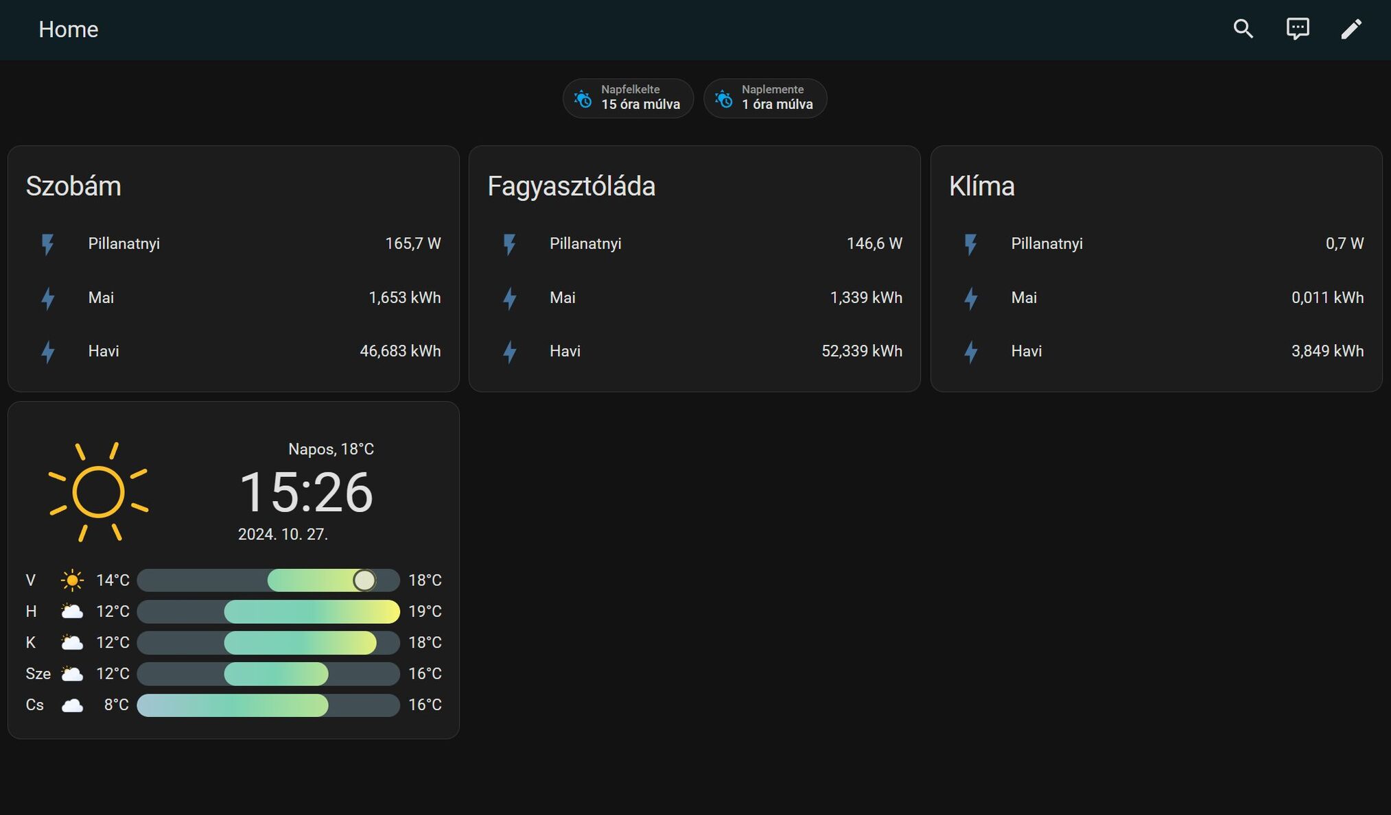 Így ma szenvedtem egy kicsit a Home Assistant telepítésével, és az ebbe integrálásukkal. Jelenleg VirtualBox-ban fut a gépemen. Mivel tetszett, igy kíváncsiságból felraktam a Clock Weather Card-ot is, na ez szenvedés volt, addig, míg rá nem jöttem hogy az alap Áttekintésbe nem lehet beletenni... külön irányítópultot kell csinálni. Ilyet nyilván felesleges megemlíteni a leírásban, de az is lehet én nem olvastam el tüzetesen (meg amúgyis még noob vagyok a HA-ban és ebben a témában), na de mindegy, már ezt is tudom és működik