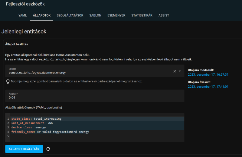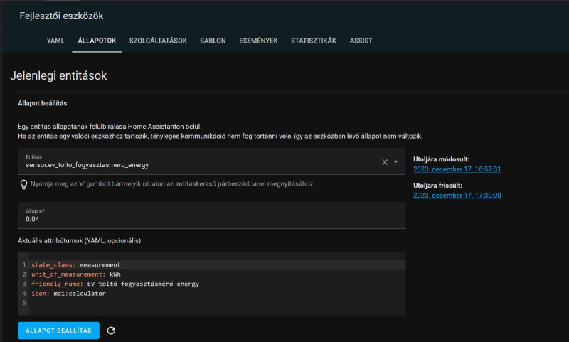 A segéd entitás szépen összead mindent... az attributum módosításokat meg kiadtam a config.yaml-ban... ezt írtam a végére:homeassistant: