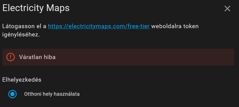 Szolgáltatói modem (Digi) úrjaindítása óta (2 napja) nem volt kapcsolat az ElecricityMap kiszolgálóval... töröltem az integrációt generáltam új API tokent és megpróbáltam hozzáadni, de csak ezt adja...