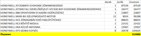 A 8 zónás vezérléshez a Honeywell konfigurátorát kitöltve kaptam egy listát, hogy mik kellhetnek ehhez, de megnézve hozzá az árakat, olcsónak egyáltalán nem mondanám: