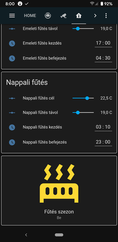 Igaz, így a lent lévő tado termosztát szinte sose kér fűtést mivel az emelet hamarabb hűl ki és mivel a padlófűtés nehezebben melegíti fel a teret, így azt hamarabb is kapcsoltatom be.