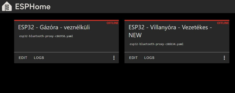 Igen köszi valóban ez volt a gond...ez után simán lefutott hibanélkül a Validálás...telepítésnél letöltöttem a bin file-t majd web.esphome.io ezen az oldalon hibanélkül feltelepítettem. Újraindítottam az esp-ket, de Offline mind kettő. Wifik között megjelentek mint ha AP-k lennének, de a routerre nem csatlakoznak már fel.