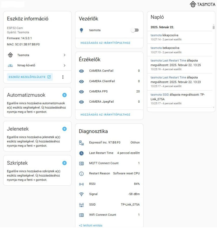 Van egy ESP32-Cam boardom, amire felraktam volna az esphome-t raktam, de sokadig próbálkozás után feladtam, mert wifire mindig hibát dobott. Most Tasmota van rajta, minden rendben ment, beállítottam amit kellett, de egyszerűen nem kapok camera entitást és nem jön be a kép. Ip címet beírva bejön+ "eszköz kezelőfelülete" -re kattintva is bejön a kamera, de dashboardként nem tudom kirani. A Tasmota32 webcam-ot raktam rá egyébként.